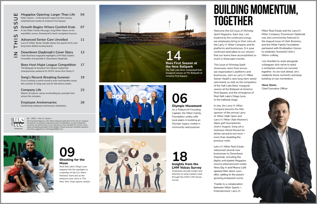 This issue of Winning Spirit showcases news from across our organization’s platforms and businesses, such as Larry H. Miller Senior Health’s new long-term senior care brand, as well as the completion of the Salt Lake Bees’ inaugural season at the Ballpark at America First Square, and the emergence of Real Salt Lake’s Diego Luna to the national stage.